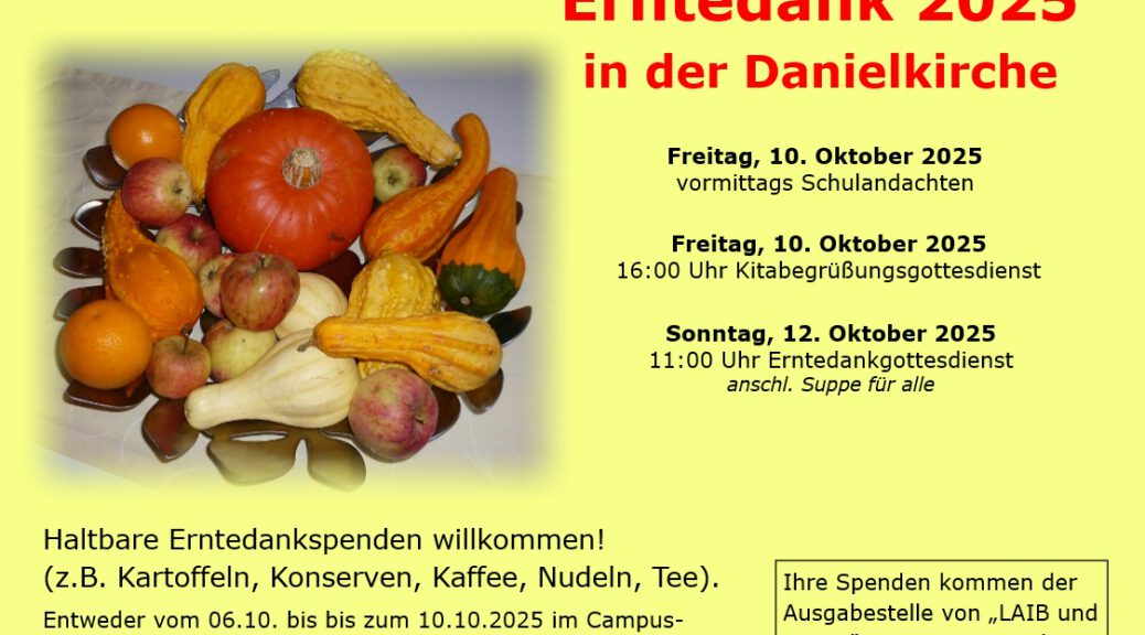 Wegen des Feiertags am 03.10.2025 feiern wir eine Woche später. Doch Erntedankspenden für LAIB und SEELE sind auch an diesem Wochenende willkommen. Bitte ab 06.10.2025 in der Küsterei abgeben.